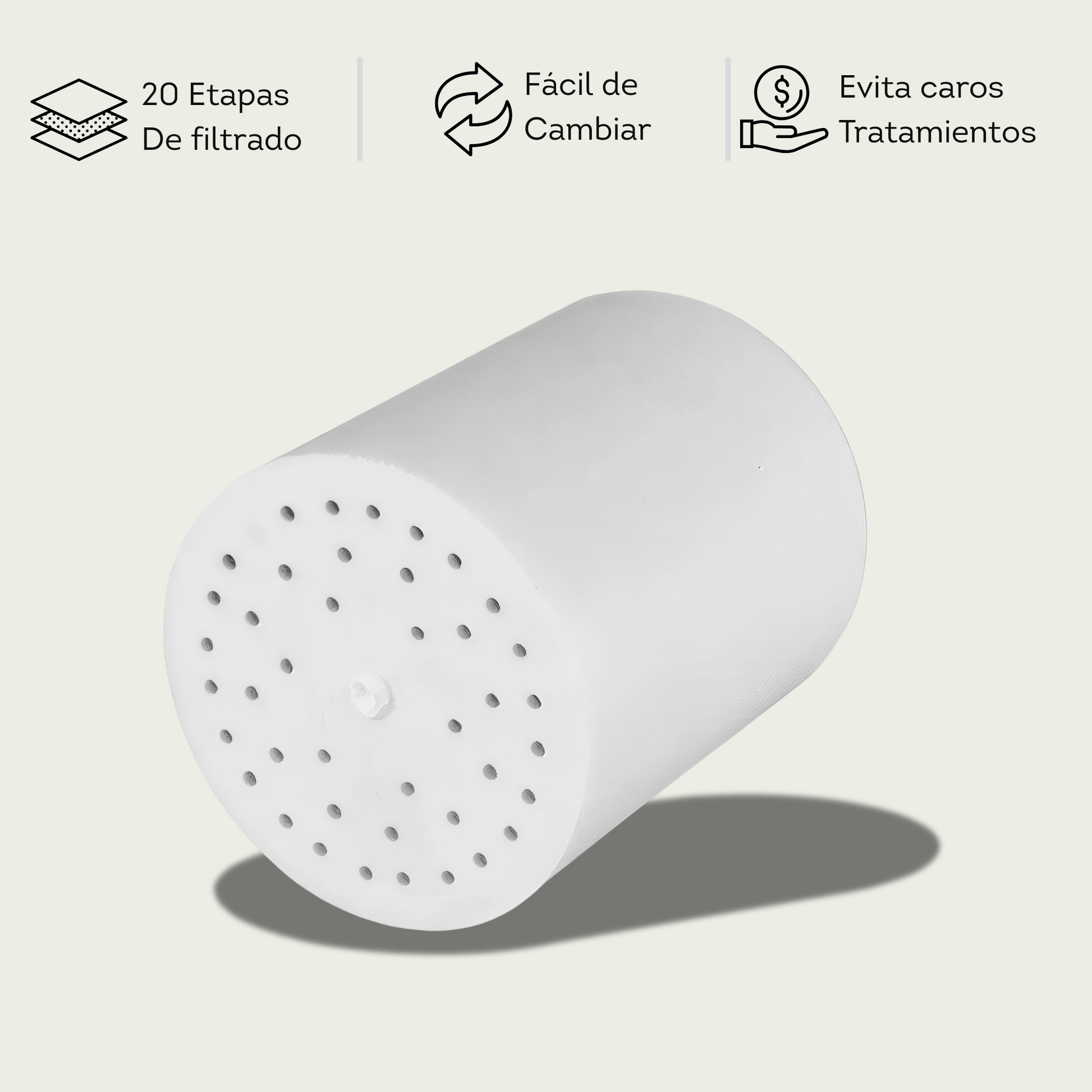 La regadera Altuva está compuesta por dos piezas principales y se desarma girándola. En la parte interior se encuentra el filtro. Una vez transcurridos 90 días de uso, lo cambiamos por uno nuevo y estamos listos.